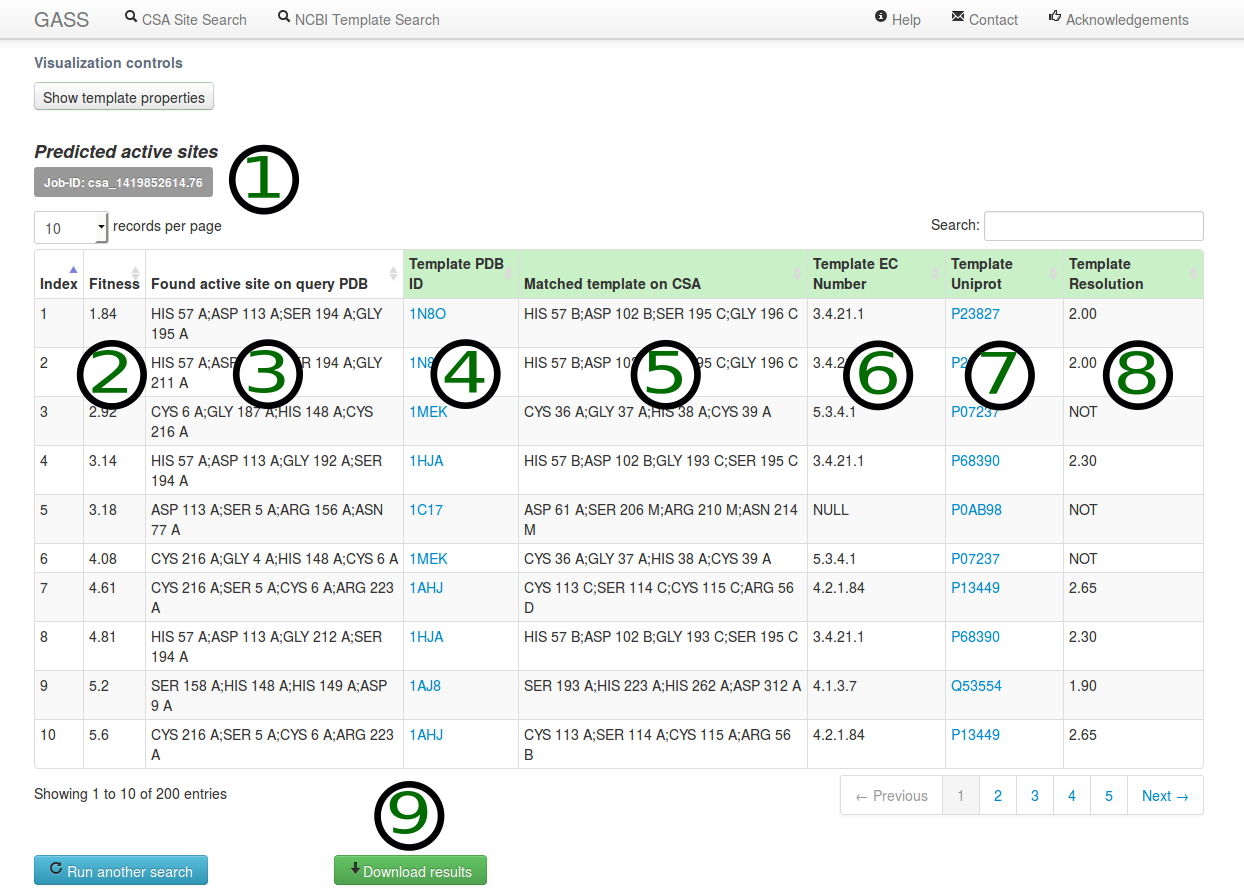 EC Number (6), Uniprot accession code (7) and resolution (8) of matched template.